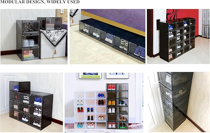 - [EXCELLENT PROCESS TECHNOLOGIES, BEAUTIFUL & GENEROUS] Each side of the shoe case is beautiful and generous. The material surface is smooth and will not scratch your hands. Colors of clear and black is basic hue, suitable for various home styles. [ENVIRONMENT-FRIENDLY HIGH QUALITY PP MATERIALS SELECTED] Fresh and tasteless, feel at ease. [THE HANDLE IS ALSO A VENT]To keep air ventilation.