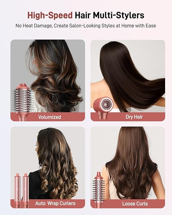 - High-Speed 5-in-1 Hair Styler for Quick Styling: This hair styling tools features a 110,000 RPM professional brushless motor and 23m/s high-speed airflow for fast drying. Effortlessly get salon-quality results at home in less time with reduced heat damage – dry, curl, volumize, straighten, smooth frizz, and add shine. This hair dryer brush kit includes fast dry hair blow dryer, volumizing brush, round brush for loose curls, air curlers for hair, and a nice travel/storage bag.