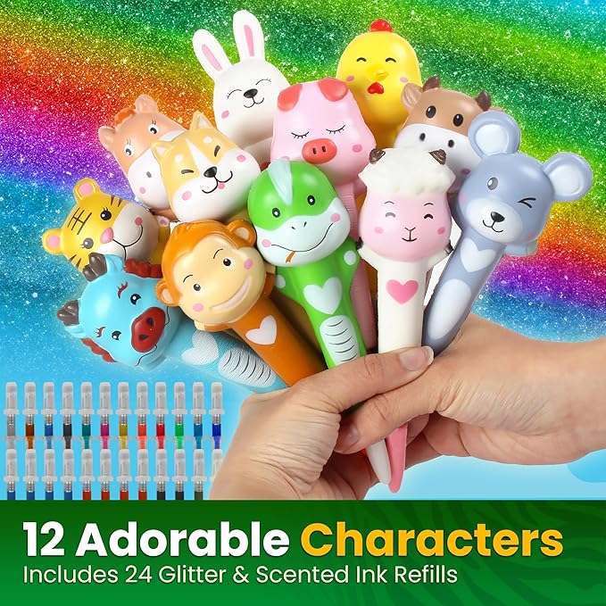 24 Scented Glitter Ink Refills – Each squishy pen comes with colored glitter gel ink that is also scented! Plus 24 ink refills for long-lasting fun.