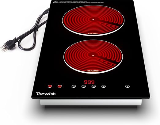 - Double Burner Electric Cooktop: The Topwish electric cooktop boasts 2 independent cooking zones, each powered by high-performance burners of 1000W & 800W, ensuring rapid heating and swift cooking. With a total of 9 power levels to choose from, you can easily cook, simmer, steam, slow cook, and stir fry