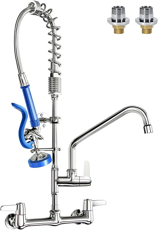 - 【Commercial Sink Faucet for Kitchen Sinks】: This faucet mounts to the wall using a pair of adjustable female inlets with a center distance of 7 3/4″ to 8 1/4″, allowing you to fit them directly onto your facility’s water lines with ease. Suitable for 1 or 2 compartment professional-grade commercial kitchen sinks, it meets a wide range of kitchen configurations and installation requirements.