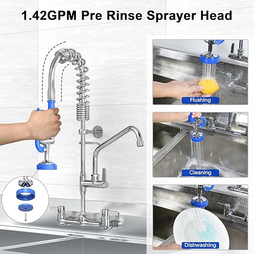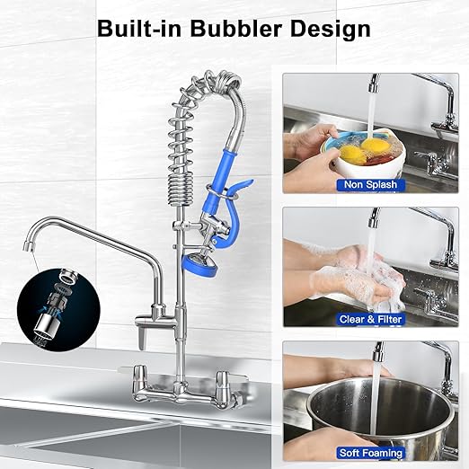 - 【Commercial Faucet with Pre-Rinse Sprayer】: This heavy-duty commercial faucet with a spray head is perfect for most commercial kitchen sinks. Ideal for high-use commercial kitchens, it offers both stream and spray modes, providing a convenient and efficient cleaning solution for busy kitchen staff, including chefs and dishwashers.