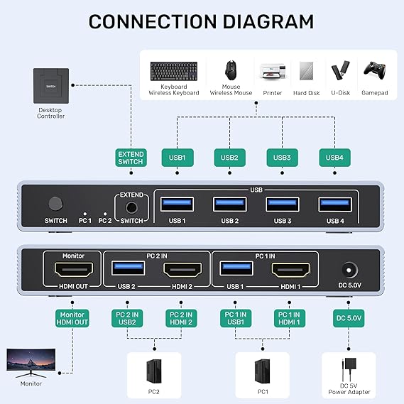 Package Contents: 1 x USB HDMI KVM Switch, 2 x USB A to A cables, 1 x Desktop Controller, 1 x DC 5V Power Adapter, 1 x User Manual. Please contact us if you have any questions before purchase or during use. We provide 24H customer friendly support service.