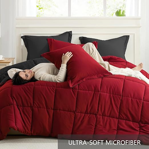 • ONE COMFORTER, TWO MOOD. The Black and Red comforter set can be reversed depending on your bed sheets and your mood. The reversible comforter set can be used as a twin duvet insert or as a stand alone comforter. There are more colors available, gray, navy, blue, brown, beige, white, black, pink, purple, lavender, teal and ivory, sage green and beige, olive green and sage green, burnt orange and beige, black and red.