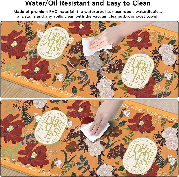 - Safe & Sturdy Material: Our farmhouse anti-fatigue kitchen mat is made of premium and safe PVC material. Design with rich vintage elements and real color, adds an elegant touch in any area of your home. The surface of the antifatigue kitchen mats repels water, liquids, oils, stains, and any spills, kitchen rugs and mats non skid washable can also protect your floor from spoiling, and let your floor look more simple and clean.