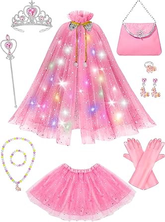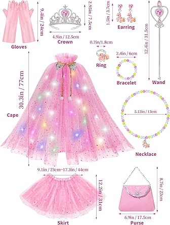 • Complete princess Set: Fuzmo princess dress up clothes set includes a ring, ear clips, gloves, crown, handbag, bracelet, necklace, wand, princess cape, and a luminous light strip. Every detail is carefully designed to ensure your child can enjoy the complete fun of dressing up as a princess.
