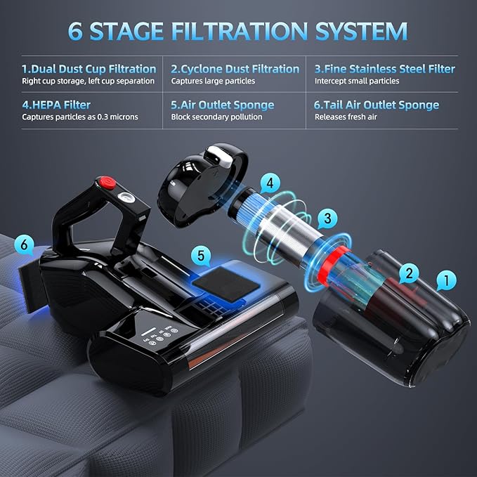 - 【Multiple Filtration System】Mattress vacuum with a multi-stage filtration system for precise layered filtering. The latest HEPA filter for deep purification, capturing 99.97% of particles as small as 0.3 microns, releasing fresh air. The dual dust cup design separates dust and hair to prevent filter clogging and maintain strong suction.