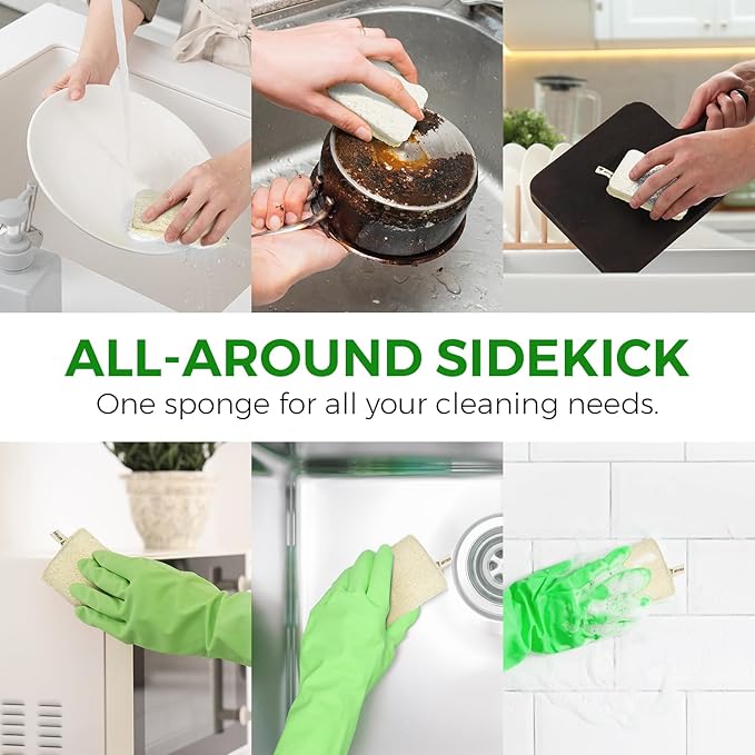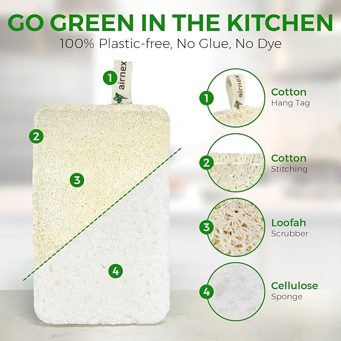 - NATURAL SPONGES FOR DISHES – Crafted with natural cellulose sponge, a loofah scourer, cotton stitching, and a cotton hanging tag, these premium sponges are entirely plastic-free and designed to keep your kitchen green.