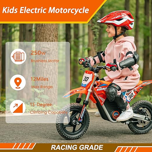 OLALA 36V Electric Dirt Bike for Kids Aged 3-8, Brushless 250W Racing Grade Electric Motorcycle, Up to 15.5MPH & 3 Speed Settings, Safe Disc Brakes, 12” Off-Road Knobby Tires, Orange