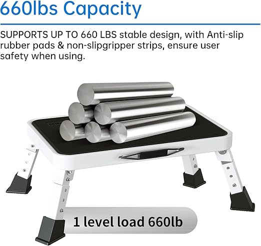 Portable and Easy to Store: The metal folding step stool can be easily folded with a handle and weighs only about 4.8 pounds, making it lightweight and easy to carry.