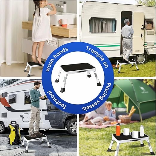 Multipurpose: RV step stool has three adjustable height great for reaching items in higher areas such as closets and kitchen pantries. It can also be used as a convenient bathroom step stool for children to help them brush their teeth or wash their hands, and to help them reach kitchen countertops and cabinets.