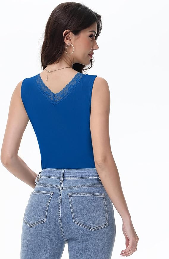 Tanou Womens Sexy V Neck Tank Tops Lace Trim Sleeveless Ribbed Slim Fit Casual Basic Top