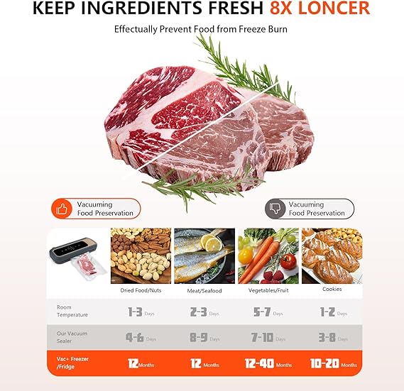 Shrink wrap sealer: Fight food spoilage, extends freshness by up to 5x. Whether preserving seasonal produce with your vacuum sealer for food freezer or sealing marinated meats with the double pump system, food bag sealer keeps groceries and meals fresher longer